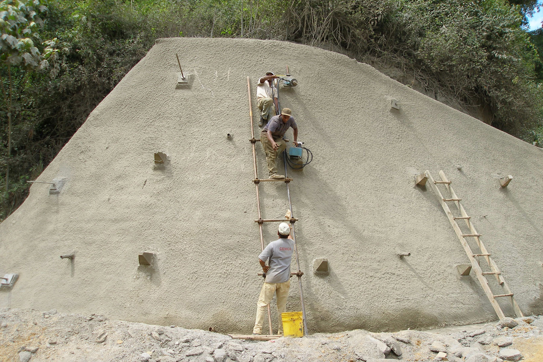 LEER MAS ▼Los muros anclados no tensionados o con anclajes pasivos están constituidos por pernos estructurales mejor conocidos como varillas o cabillas de acero, las cuales se colocan dentro de una perforación, que posteriormente es inyectada con cemento para unir la cabilla al macizo de roca. Esto significa que el macizo de roca se refuerza por intermedio de la cabilla de acero. Debido a esto se puede evitar las caídas de roca y en ocasiones los deslizamientos de macizos de rocas fracturadas con discontinuidades muy espaciadas. El diseño de los pernos generalmente es empírico basado en un análisis de discontinuidades en el macizo y de la estabilidad de los bloques. La parte mas importante del diseño es determinar donde estará ubicado, con que inclinación y que longitud debe tener cada perno.